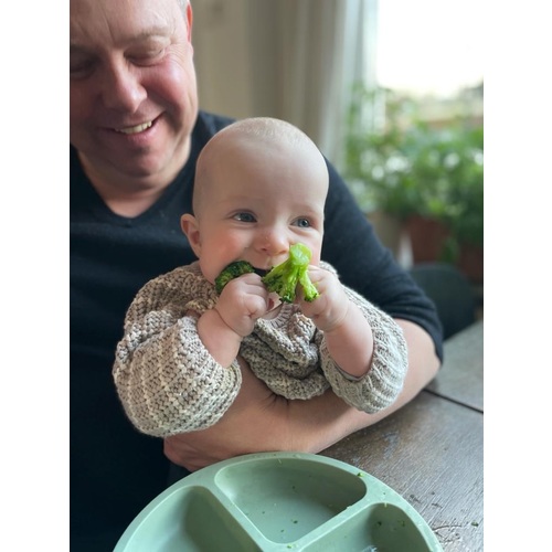 Ik ben er deze week mee begonnen! Hapjes met de leper gaan er echt niet in hier. Dit gaat heel goed. Vandaag komkommer en broccoli:) hij vindt het echt leuk!
