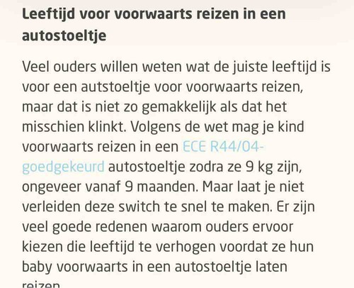 Ik heb een auto stoel die vanaf 9 kg richting voren vervoerd mag worden.