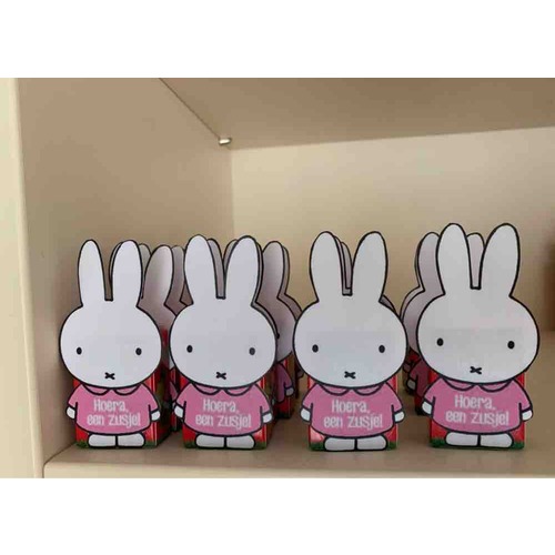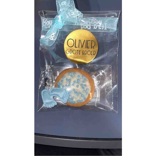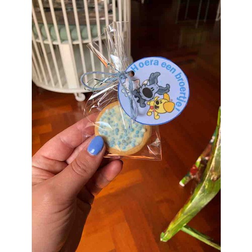 Ik heb voor het kdv van m’n zoontje koekjes gekocht bij de Plus. En die verpakt en een ‘label’ aangemaakt. Kraamvisite krijgt gewoon beschuit met muisjes.