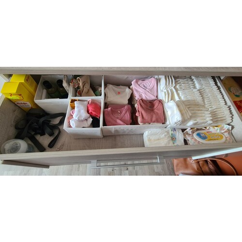 Bovenste la heb ik kleding, de middelste la heb/had ik de hydrofielen, washandjes, slaapzakken, verschoonkussenhoezen en nieuwe wasgel/olie dat soort dingetjes. De onderste la liggen de nieuwe kleding in grotere maat.