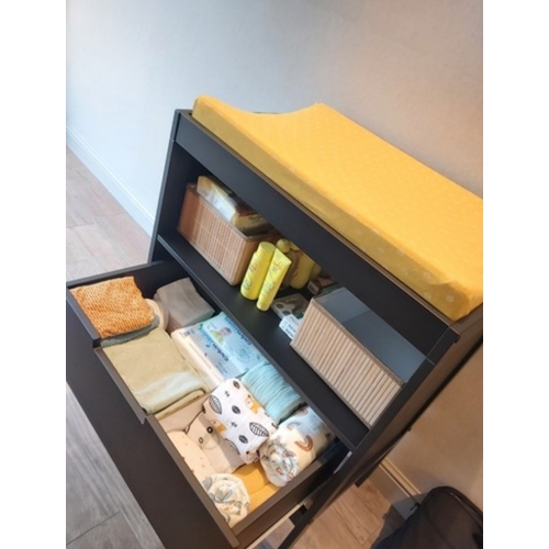Op de commode zelf hebben we een mandje met babypoeder, olie, wasgel, haarborstel, vitamines enzo. Dat wat we dagelijks gebruiken en de plank boven de commode hebben we een mand met luiers liggen. Daar leggen we dr pyjama en slaapzak die ze aan heeft overdag neer. Daar komen de luiers van baby2 ook te liggen straks. Ze gaan samen een kamer en dus commode delen.