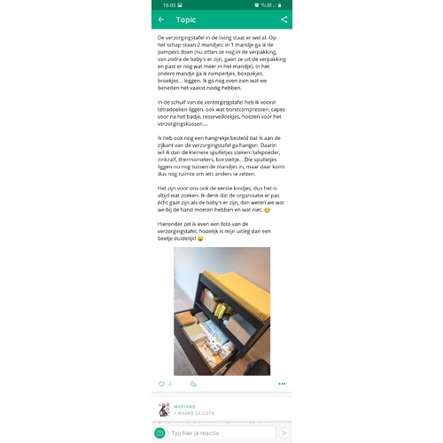 Er is hierover al eens een vraag gesteld, ik heb toen geantwoord op dat topic. Ik heb even een screenshot genomen van mijn antwoord van toen. 😊 Moest het niet duidelijk zijn, laat je het maar weten! 😊 Op de babykamer staat ook een commode, maar daaraan kan je het geslacht zien en dat houden we geheim. Wij verwachten een eeneiige tweeling. 🥰