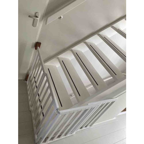 Wij hebben ook een open trap in de woonkamer. Tegen de achterkant aan staat een kast zodat hij daar niet bij kan komen en qua traphekje gaan we inderdaad voor zo’n constructie met een hoekstuk.