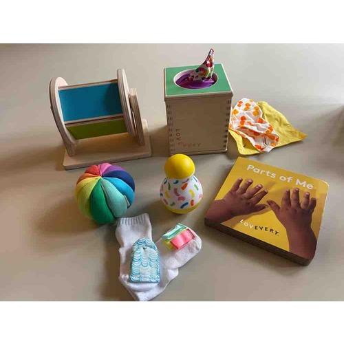 Wij hebben de play gym en daar speelt onze dochter veel mee. Ze blijft hem leuk vinden ondanks dat we hem al een tijd hebben. We hebben nu ook een eerste play kit. Tot nu toe bevalt het goed. Het is wel erg duur voor wat je krijgt. Maar ze lijkt de speeltjes interessant te vinden, vooral het regenboograd, wobbelaar en de tissuedoos.