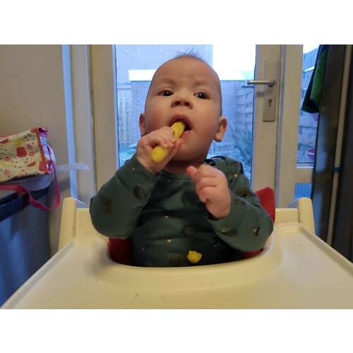 De sticks plakken nogal in de mond. Wij geven onze kleine een broodkorst al ...