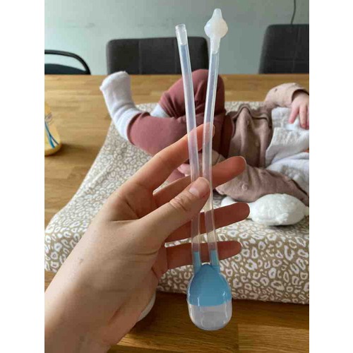 Neus uitspoelen en uitzuigen vindt ze echt niet leuk. Maar even doorzetten, dan heeft ze wel weer wat adem vrijheid. Ik doe het altijd voor de flesvoeding, dan heeft ze daarna goede troost.