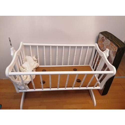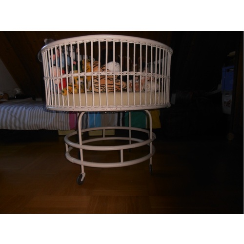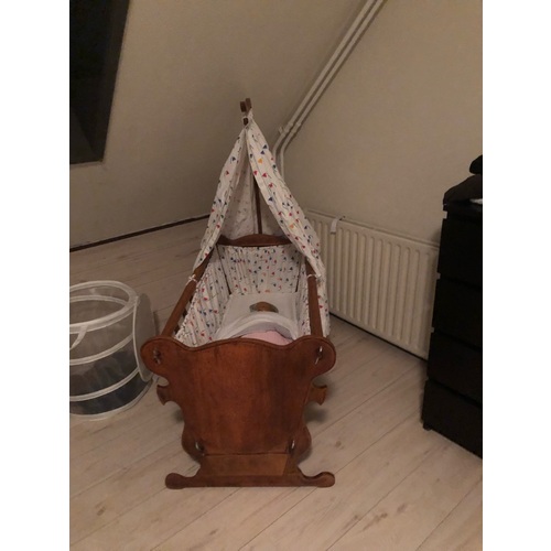 Dit is ons wiegje(hier nog met mijn oude pop erin als voorbeeld) heb hem wel helemaal opgeknapt en in originele staat terug gebracht. Iemand had hem in de loop dr jaren rood geschilderd maar was niet echt onze smaak en niet mooi gedaan, allemaal druipers van de verf. Dus alles kaal schuren en opnieuw gelakt en vergeleken met foto’s met mijn vader erin, was hij echt weer precies dezelfde kleur.