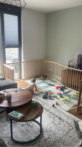 Het zit bij ons in de hoek van de woonkamer. Dus in combinatie met de hoek en onze bank kon ik het hekje goed bevestigen.