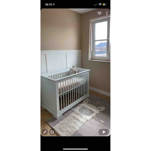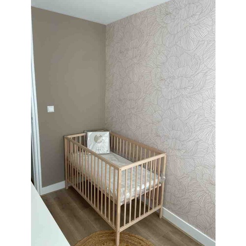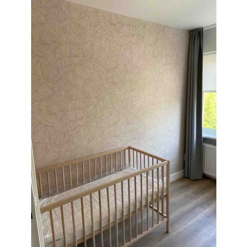 Ik heb dit op de muren (bovenste helft is behang en onderste helft verf in een beetje aarde/oudroze met een houten plintje). Verder heel rustig kamertje met een dubbele hemnes als commode/kast en een ledikantje. Misschien nog een stoel.