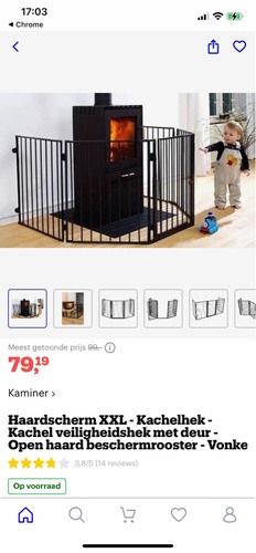 Hier kunnen nog handjes door en we kunnen het hek niet ver genoeg van de kachel zelf zetten gezien onze andere meubels (niet zomaar te verplaatsen).