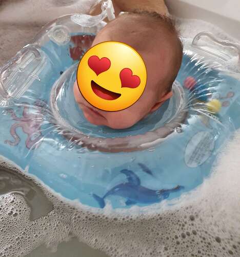 Ik heb de ring gekregen, dus ik weet niet waarvan hij is... Wij laten het hele bad vol en zij drijft dan tussen ons in een minuut of 10, niet langer... Het is zo leuk dat ze vrij met haar armpjes en beentjes kan bewegen... :-)! Soms ook nog even chillen op het badmatrasje... onze eigen baby-spa! ;-)