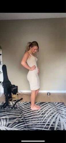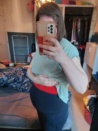 Wel wat afgevallen ten aanzien van begin gewicht, maar toch al een aardige buik nu. Normale broeken zitten heel oncomfortabel en ben blij dat er nog grote truien over kunnen haha!