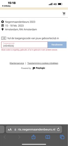 https://www.24baby.nl/24baby-lounge-negenmaandenbeurs/ Als het goed is hoef je via deze link geen code in te vullen. Kies vooral de goede dag. Het tijdstip maakt niet uit! Hopelijk tot komende week :)