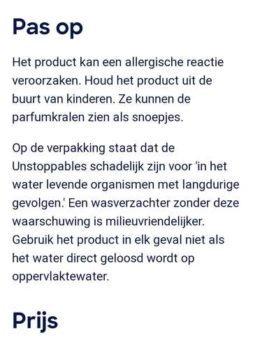 Staat ook op de verpakking dat er een bepaald bestanddeel in zit wat een allergische reactie kan veroorzaken én dat het heel slecht is voor milieu/dieren in het water.