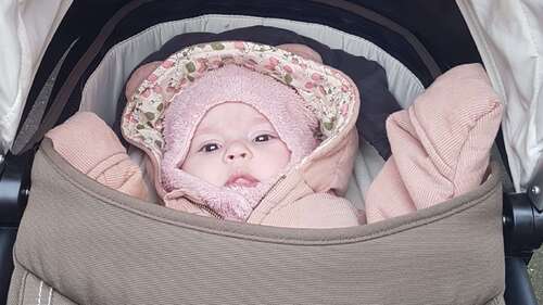 Hier gewoon zijn normale kleertjes, jasje, dekentje (dubbelgevouwen) en een muts. Als er een harde koude wind staat, dan doe ik de regenhoes er omheen