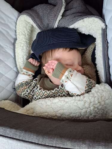 Onze zoon gaat met gewone kleertjes in een wollen onesie, wollen onderlegger in de wagen, muts en capuchon op, gevoerde slofjes aan, dekentje erover, elektrische kruik bij zijn voetjes en het dekje van de wagen er op geritst. Onze kleine koukleum heeft het zo heerlijk warm!
