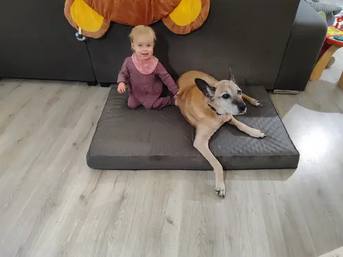 Ze weet dat ze niet in de mand mag van de hond. Hond is oud. Vindt dit echt niet leuk. Maar wel een leuke foto