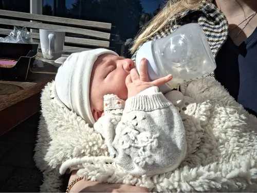Echt heel bizar maar onze dochter deed dat al toen ze 1 maand was. Wel in bepaalde houdingen natuurlijk. Nu is ze er meeeeega handig in. Wij hebben een dikke fles, misschien dat dat helpt? Wel fijn je handen even vrij hahaha