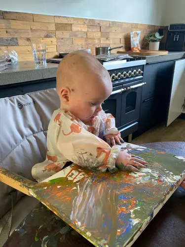 Acrylverf van de action maar je hebt bij de HEMA ook vingerverf! Alleen dat is een beperkt aantal kleurtjes en had er eerlijk gezegd niet in verdiept 🙈 ik dacht zolang het op water basis is en de vingers niet in de mond gaan is het prima haha.