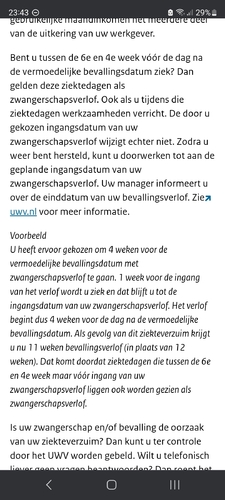 Ik ging toen ook minder werken en was ik gedeeltelijk ziek gemeld. Ik kende deze regel niet en ging doorwerken tot 4 weken voor de uitgerekende datum. Ik kreeg daarna een brief van het UWV dat mijn uitkering wordt 10 weken na de uitgerekende datum stopgezet. Ik ging bellen en hebben ze dan pas verteld dat omdat ik (gedeeltelijk) ziek gemeld was, hing mijn verlof eerder in. Dus eigenlijk heb ik 2 weken voor mijn uitkering gewerkt in plaats van gewoon thuisblijven. Ik vindt het toen verschrikkelijk, maar nu weet ik het in ieder geval.