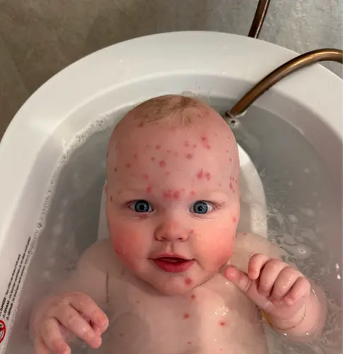 Onze dochter had het met 11 maanden. Echt heel heftig. Ze zat helemaal onder en een aantal plekjes waren ontstoken.