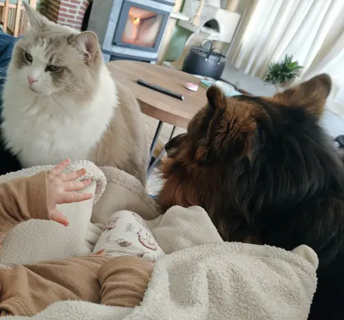 Dit is onze tweede kindje en ik heb 2 katten en 1 hond. Mijn ene kat is nog steeds hoe hij was en de ander ook wel alleen probeert die met de baby te kroelen. Mijn hond heeft in maart een acute hernia gehad en heeft opnieuw moeten leren lopen. Hij heeft net na de kleine geboren was een terugval gehad en ook een flinke buikgriep. Hij kijkt niet naar de baby om en slaapt veel overdag. 'S avonds komt hij vaak even kroelen en spelen. Voordat ik kids had waren we onafscheidelijk en voel me zovaak schuldig naar hem🥺