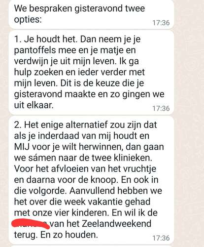 Lieve schat, wat ontzettend heftig. Heel herkenbaar in mijn situatie, vader van mijn kind zei "je kiest voor mij en laat dat ding weghalen, of je kiest om moedergans te spelen en bent mij kwijt. Dan pak je je spullen en ga ik verder met mijn leven. Laat je het wel weghalen dan zul je mijn vertrouwen moeten herwinnen en kijken we wel waar we heen gaan".. ik heb enorm getwijfeld en voelde me echt fucked up.. een topic hier gemaakt, waar heel heel heel veel reacties op kwamen welke me echt geholpen hebben! Verder gesprekken aangegaan met de GGD (keuze hulp gesprek), HA en het ZH.. uiteraard veel gepraat met de mensen binnen mijn (en ex zijn) netwerk.. uiteindelijk vol trots gekozen voor mijn zoon, en het is de beste keuze ooit geweest 🙏🏽💙 in jou situatie natuurlijk anders omdat er nog 4 andere kids in het spel zitten.. enige wat ik je kan zeggen is dat jullie samen dit kindje gemaakt hebben. Jij kan dit alleen, mocht het tot dat komen. Please laat je niet manipuleren, chanteren of kleineren. Je bent daar veel te veel waard voor. Echt waar 🙏🏽❤️ volg je mama hart, het komt allemaal goed x