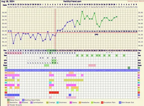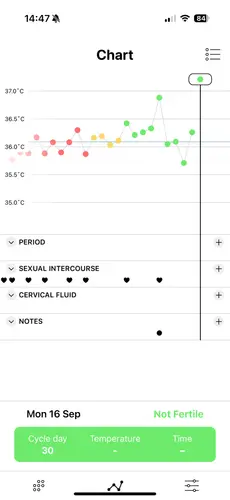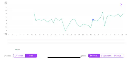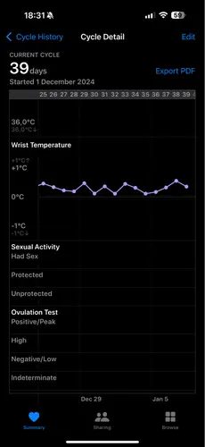 Ook ik deel graag mijn grafiek, omdat ik hier zelf heel veel aan heb gehad dit te zien bij anderen. Dit is gemeten door mijn Apple Watch te dragen ‘‘s nachts, de temperatuur is dus niet accuraat maar je ziet wel goed temperatuur stijgingen en dus ook schommelingen.