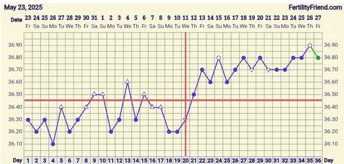 Dit is de grafiek van mijn zwangerschap destijds. PCOS dus lange cyclus, gestopt met temperaturen na positieve zwangerschapstest.