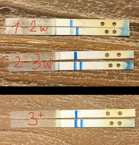 Top! Zoals ik nu denk (na heel veel filmpjes) is de strip met één streepje de strip die meet of je zwanger bent of niet. En bij de 2 streepjes heb je een controlestreep en de streep die meet hoever je bent. 🥴