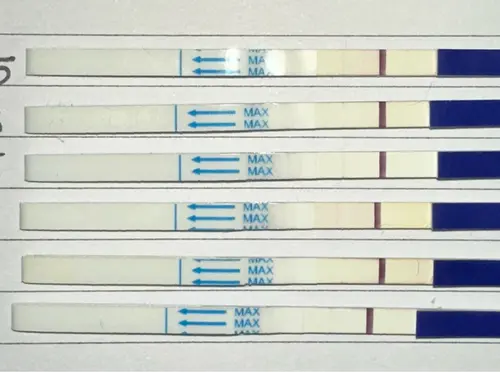De lijntjes kwamen binnen de 3/5 min, ik kon ze niet zien voordat ik de test deed dippen.