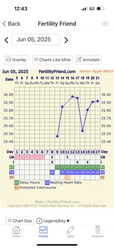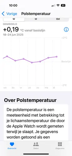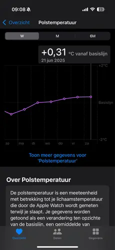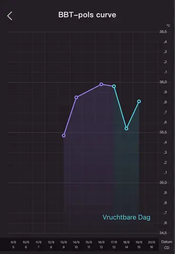 Ik gebruik ook de Apple Watch en bij mij is mijn cyclus er heel goed in terug te zien. Bij mij is na de eisprong mijn temperatuur duidelijk hoger dan daarvoor. Dat is op jouw grafiek nog niet het geval, dus ik zou zeggen dat je eisprong nog niet geweest is. Je gemiddelde basis temp zal rond de 35.9 liggen denk ik, dus dan zou het minimaal 36.2 moeten zijn