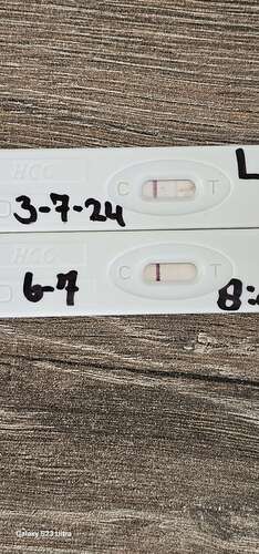 Ja naarmate de tijd werd ie donkerder, en toen ik daarvoor testen heb ik die te snel weggegooid volgende dag deed ik die test en stond een streepje, ik dacht ik pak die van daarvoor uit de prullenbak en verrek die had dus ook een 2e lijn ...