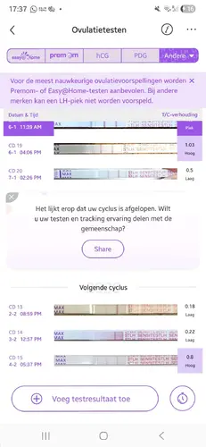 Het gaat om de onderste 3 deze cyclus. Vandaag is 0,8 maar mijn C lijn is ook heel licht. Als de Clijn veel donkerder was, had deze T lijn niet eens in de buurt gekomen richting positief. Ik vraag me dus af of deze van vandaag betrouwbaar resultaat is gezien de C lijn erg licht is