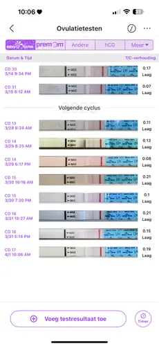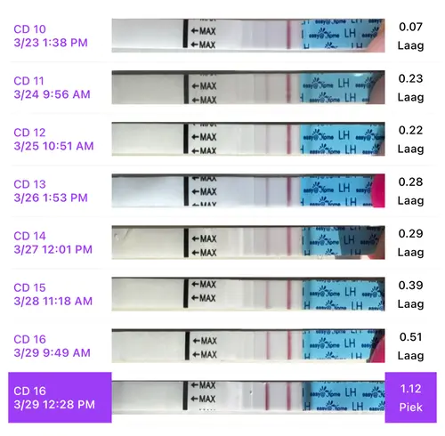 LH fluctueert altijd in je lichaam zo kan de ene dag de test heel licht zijn en de andere dag iets donkerder. Hieronder is een voorbeeld van mijn ovulatie testen. Ik heb een korte piek dus ik zie m smorgens aankomen rond middag is de piek en savonds is die alweer lichter. Denk dat als er echt een piek was of is geweest dat de test wel een heel stuk donkerder moet zijn als die wat je op dag 15 hebt. Ligt ook weer aan de concentratie van je urine hoeveel je gedronken hebt van te voren.