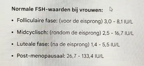 FSH (afhankelijk van waar je in je cyclus zit) 1,4 min luteale en 16,7 mag midcyclisch. Na menopauze tussen 26,7 en 133,4.