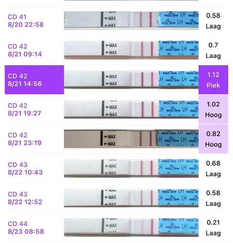 Als ik 2 keer per dag test doe ik dat rond 12-13 en rond 19-20 als mijn werkschema dit toelaat. Test soms ook op hele random tijden maar voel eigen altijd wel aan mijn lichaam als de piek eraan komt ☺️