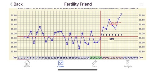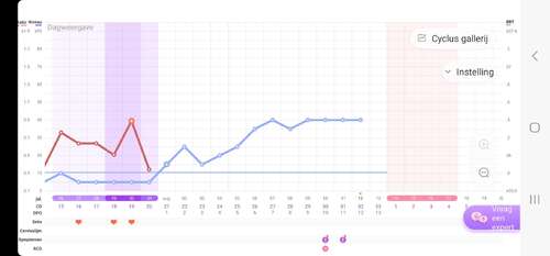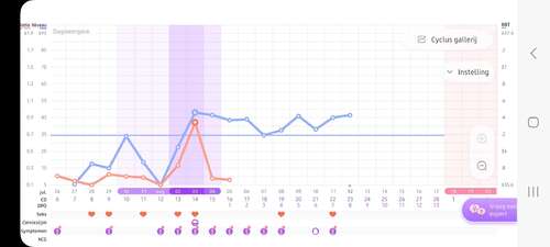 Jaa ik moet zeggen dat ik het de afgelopen week al iets minder spannend vind. Heb niet echt andere klachten (krampen, opgeblazen en gevoelige borsten) dan normaal en alles in me zegt dat het niet raak is. Jij hebt een mooie stijgende lijn🍀 verder klachten?
