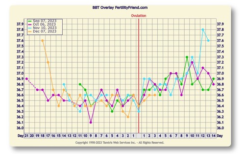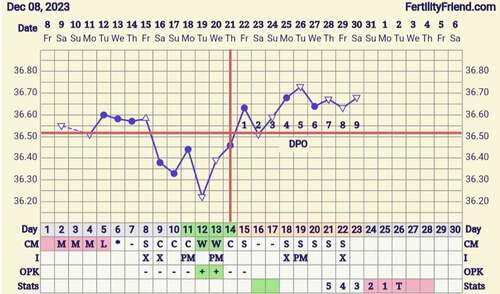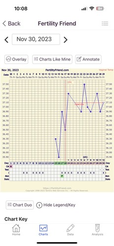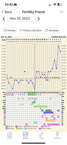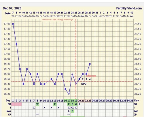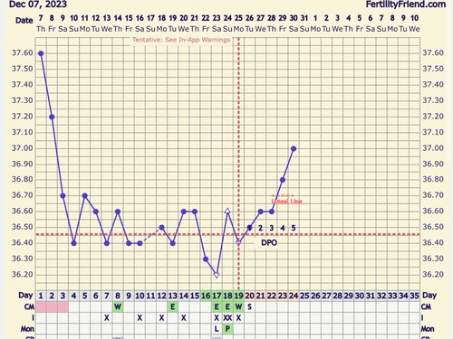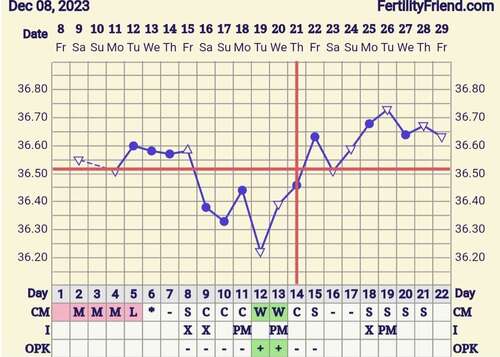 Nou mijn temperatuur is vandaag eindelijk omhoog. Ik had twijfel over de temp van de 25ste. Die was de eerste keer 36,4 en tweede keer 36,6 dacht dat de thermometer er niet goed in zat dus had het gemiddelde genomen. Nu deze toch op de eerste gezet en we kregen een kruis. Dus nu hooen dat de temperatuur hoog blijft🙏