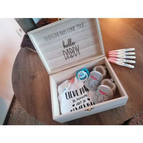 - een pizza bestellen en vragen of ze erin schrijven 'daddy who loves pizza' of iets in die trant. Als hij het ziet, je eigen test naar voren halen. En in het kader van je eigen pizza fotograferen, kun je een video opnemen en als hij 'z'n doos' opent (馃ぃ) gelijk zijn reactie filmen.