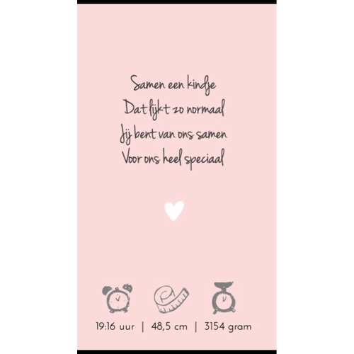 Op ons geboortekaartje hebben wij onderstaande tekst staan. Want we weten allemaal dat zwanger worden voor ons niet de normaalste zaak van de wereld is. En vooral het stukje ‘jij bent van ons samen’ vind ik zelf erg mooi.. ook al zit er niets genetisch in onze dochter van mijn vrouw, ze is 100% haar moeder ❤️