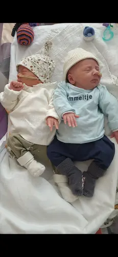 Ik ben bevallen op 1/8/23 van onze j/m tweeling. Spontaan gebroken vliezen op 1/8 rond 16u. Toen naar ziekenhuis gegaan en moeten we eerst afwachten of het wel door zou zeggen. We zijn toen nog met de ambulance naar en ander ziekenhuis gebracht omdat het ziekywaar ik in eerste instantie was geen ruimte had op de kinderafdeling mocht ze geboren worden. Ik was 34 weken toen mijn vliezen braken. Naar mate de avond vorderde kreeg ik meer weeën en bij ontsluiting voelen had ik 4cm. Omdat de kinderen allebei is stuit lagen toen overgegaan op spoed keizersnede. En toen zijn Melle en Bente om 23.56 en 23.57 geboren. Gelijk in de couveuse en naar de kinderafdeling. Uiteindelijk na 4 weken ziekenhuis met elkaar naar huis gegaan. Ons zoontje heeft rond de bevalling nog een hersenbloedinkje gehad, heeft hij gelukkig niks aan overgehouden. Ik had net 4 dagen een datum voor de geplande keizersnede maar het liep allemaal even anders.