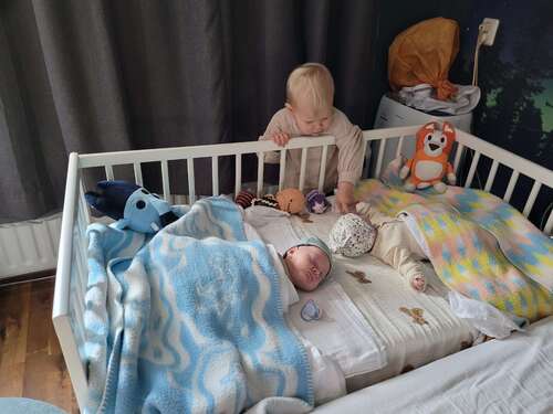 Hier in twee losse wiegjes en straks 2 ledikantjes.