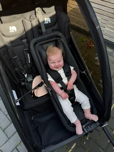 Wij hadden zelf een maxi Cosi erin gemonteerd, omdat onze dochter nog maar 4 maanden is en nog niet zelf kan zitten. De babyschaal van Deryan was ook nog niet op voorraad. Vorige week wel weer, dus die besteld, maar het lijkt alsof de maxi Cosi steviger zat en ze leek daar comfortabeler in. We twijfelen dus of we de babyschaal houden.