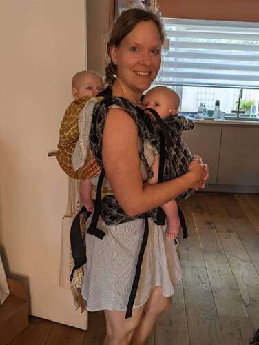 Heb toen ze klein waren een draagconsult gehad. Wat je kan doen is 1 kindje in 'de ruck' op je rug knopen met een doel en dan de ander ofwel jn dezelfde doek op je buik of in een draagzak op je buik.