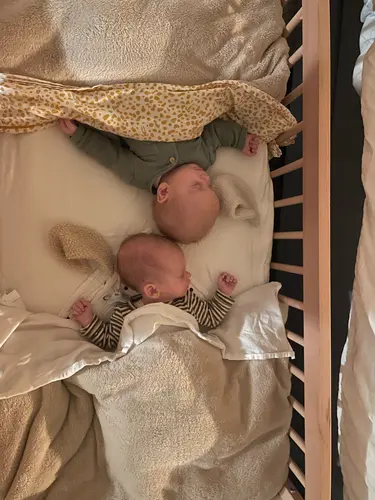We legden ze dan met de rugjes tegen elkaar, en de lakens goed strak ingestopt. Maar nogmaals, kraamzorg vindt dit niet fijn en zal dit zeker niet adviseren, wat ik ook wel begrijp. Wij deden dit alleen overdag als ik ernaast lag in bed. Snachts ieder in zijn eigen helft van de cosleeper.