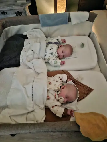 Wij hebben beide een cosleeper naast ons bed staan en ieder heeft zn eigen baby ‘s nachts. Dit was voor ons makkelijker omdat ik toch eerder wakker was dan mn man en nu kan ik weer omdraaien als “mijn” baby niet huilt. Met z’n tweeën in een ledikantje hebben we geprobeerd, maar het zijn wilde slapers.