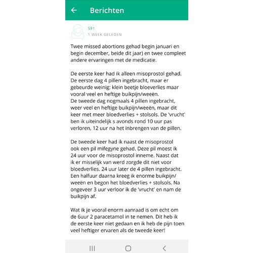Tweede missed abortion bij 10 weken (vruchtje al gestopt bij 8 weken) niet gewacht en direct mifegyne genomen en 36 uur later 1 kuur misoprostol. Binnen paar uur vruchtje verloren. En minder pijnlijk dan de vorige ervaring.