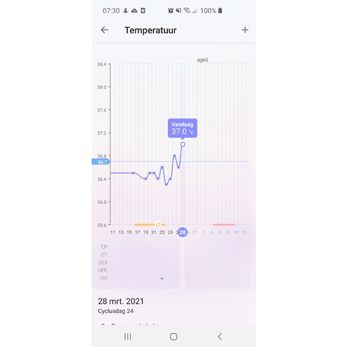 Dit is mijn kaart, temperatuur altijd om 7 uur, nu om 7 en om 8 uur gedaan vanwege de klok. 7 uur was 't 36,65 en om 8e 36,55 dus heb gemiddelde van 36,6 aangehouden vandaag, was dus vroeger op de dag warmer terwijl ik dat wel gek vind mja nog ff wachten denk 馃槉 ovulatietesten blijven wit, zwangerschap test was al heel snel wit na miskraam