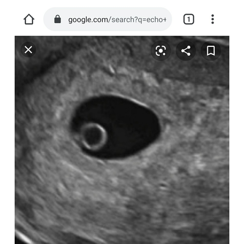 Op deze echo zie je een groot rondje (links) en dat is een dooierzak. Daar aan vast zit dan een vruchtzakje met (of helaas soms zonder) vruchtje.